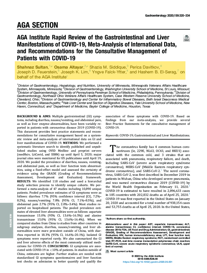 AGA Institute Rapid Review of the Gastrointestinal and Liver Manifestations of COVID-19, Meta-Analysis of International Data, and Recommendations for the Consultative Management of Patients with COVID-19