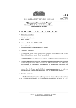This Test Guideline describes the methods allowing the determination of the dissociation constants in water. The dissociation is the reversible splitting into two or more chemical species which may be ionic.