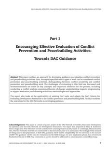 This report outlines an approach for developing guidance on evaluating conflict prevention and peacebuilding activities. First, the report specifies which types of work can be considered conflict prevention and peacebuilding activities, distinguishing between conflict sensitivity and conflict prevention and peacebuilding work. The challenges of evaluating in this field are discussed and recommendations are made on key concepts and important elements for the process, including conducting a conflict analysis; examining theories of change; understanding impacts; programming to support evaluation; and choosing evaluation methodologies and approaches. The report also looks at the applicability of existing DAC tools, and adapts the DAC Criteria for Evaluating Development Assistance to the conflict prevention and peacebuilding field. Finally, it outlines the next steps for the DAC Networks in developing guidance.