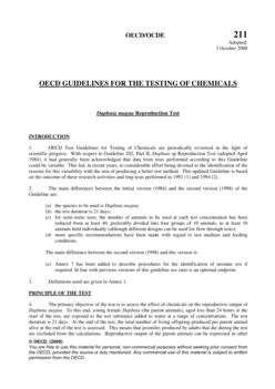 The test method described in this Test Guideline assesses the effect of chemicals on the reproductive output of Daphnia magna Straus. To this end, young female Daphnia are exposed to the test substance added to water at a range of concentrations (at least five). For semi-static tests, at least 10 animals at each test concentration and for flow-through tests, 40 animals divided into four groups of 10 animals at each test concentration, are used. The test duration is 21 days. Reproductive output of the parent animals and the total number of living offspring produced per parent alive at the end of the test should be reported. The study report should also include: the daily counting of the offspring, the daily recording of the parent mortality, the weekly measurement of oxygen concentration, temperature, hardness and pH values and the determination of the concentrations of test substance. Optionally, the sex ratio of the offspring may be recorded. The reproductive output of the animals exposed to the test subs...