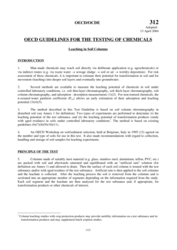 The method described in this Test Guideline is based on soil column chromatography in disturbed soil. Two types of experiments are performed to determine (i) the leaching potential of the test substance, and (ii) the leaching potential of transformation products in soils under controlled laboratory conditions. At least duplicate leaching columns are packed with untreated, air-dried and sieved soil (< 2 mm) up to a height of approximately 30 cm. Afterwards they are saturated and equilibrated with an “artificial rain” solution and allowed to drain. Then the surface of each soil column is treated with the test substance (non-volatile in water and soil) and/or with aged residues of the test substance. Artificial rain is applied to the soil columns and the leachate is collected. After the leaching process the soil is removed from the columns and is sectioned into an appropriate number of segments depending on the information required from the study. A reference substance (atrazine or monuron) should be u...