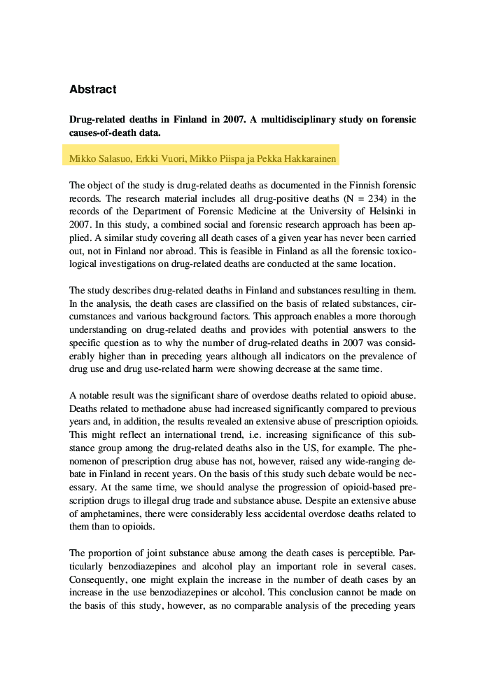 Finnish drug death 2007: Interdisciplinary study of forensic death cause documents